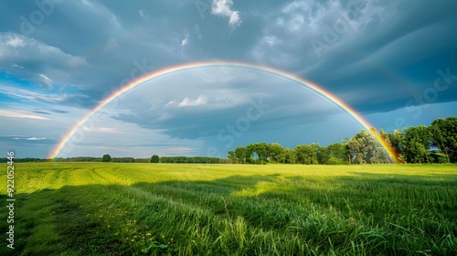 Naklejka premium A vibrant rainbow arches over a lush green field after a summer rainstorm in...