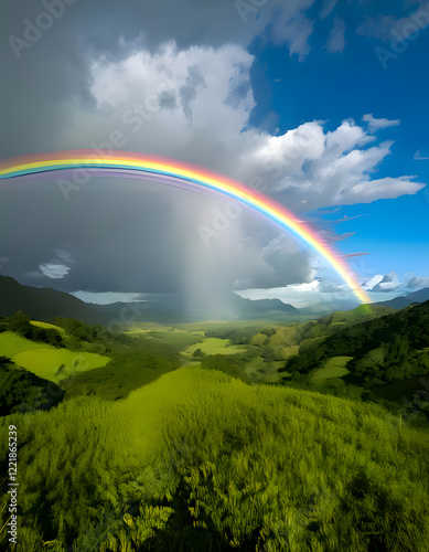 Naklejka premium A vibrant rainbow arches over a lush green valley with rolling hills and...