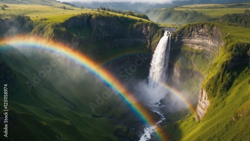 © Ardi, Fototapeta premium A vibrant rainbow arches over a majestic waterfall cascading down lush green cliffs in a scenic landscape.