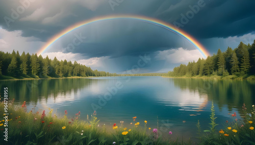 © Shahzadi Studio, Naklejka premium A vibrant rainbow arching across a serene lake surrounded by lush greenery, with a dramatic cloudy sky in the background