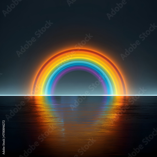 Naklejka premium A vibrant rainbow arching over a dark water surface with its colorful...