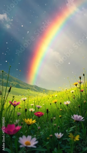 Naklejka premium A vibrant rainbow arcing over a lush green meadow, sunlight illuminating...