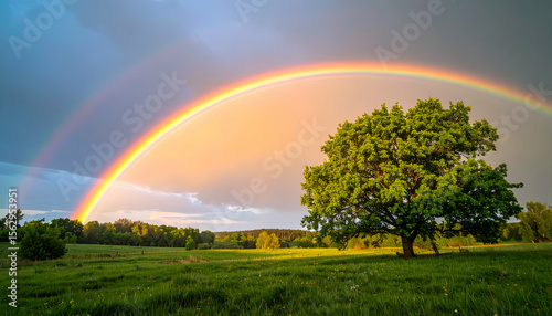 Naklejka premium A vibrant rainbow arcs over a lush green landscape with a solitary tree.