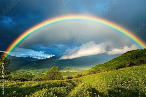 Obraz premium A vibrant rainbow arcs over a lush green landscape with mountains and cloudy...