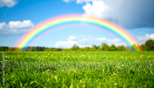 Naklejka premium 草原に架かる鮮やかな虹。レインボー。A vibrant rainbow over the grassland.