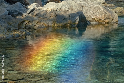 Fototapeta premium A vibrant rainbow reflected in crystal-clear water, nestled among serene rocks.