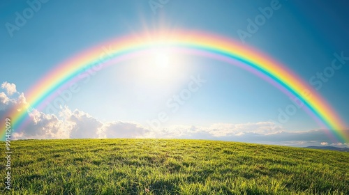 © Suphawan, Obraz premium A vibrant rainbow stretching across a clear blue sky, arching over a lush green field after a summer rainstorm, with sunlight shining through the clouds.