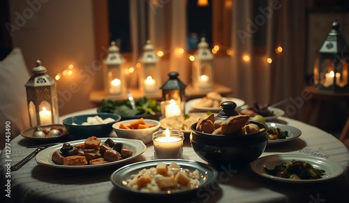 Naklejka premium A vibrant Ramadan Iftar scene set in a lush garden, with colorful lanterns, glowing candles, and a feast of fresh Mediterranean dishes under a twilight sky