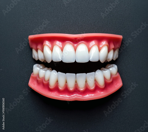 © PrusarooYakk, Obraz premium A vibrant, realistic dental model showcasing full upper and lower human teeth, set against a dark background.