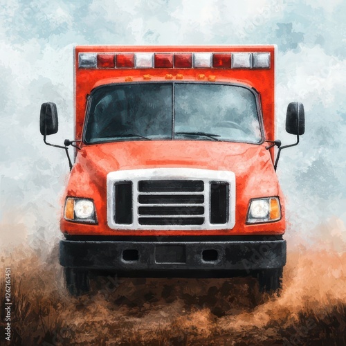 Obraz premium A vibrant red ambulance stands ready, its emergency lights flashing, set...