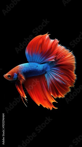 Obraz premium A vibrant red and blue betta fish with flowing fins against a black background.