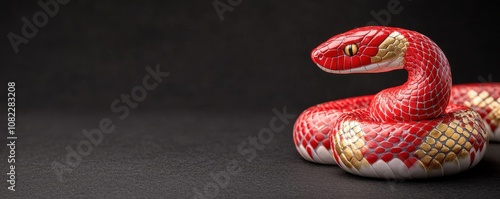 Fototapeta premium A vibrant red and gold snake gracefully coiled on a dark surface, showcasing...