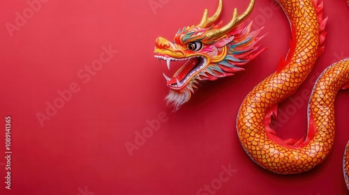 © mangolovemom, Obraz premium A vibrant red background features a stylized dragon, showcasing intricate designs and colors, symbolizing strength and good fortune.