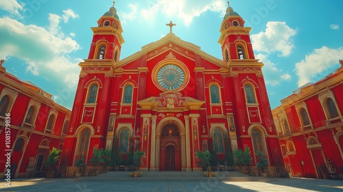 Obraz premium A vibrant red church with a grand facade and decorative elements.