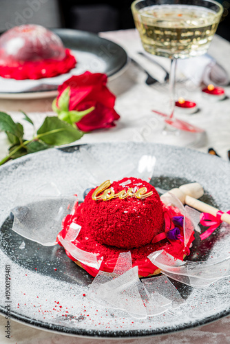 Fototapeta premium A vibrant red dessert with a love sign sits elegantly on a romantic table...