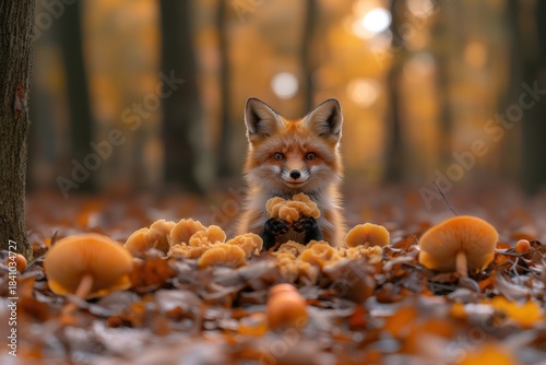 © Miramiska, Obraz premium A vibrant red fox rests peacefully in a woodland clearing, enveloped by a rich carpet of autumn leaves and colorful mushrooms. A serene wildlife scene.