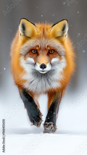 © Iswanto, Fototapeta premium A vibrant red fox running through a snowy landscape, showcasing its striking fur and expression.