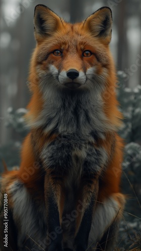© ME_Photography, Fototapeta premium A vibrant red fox sits gracefully amidst soft flowers, surrounded by a tranquil misty forest, showcasing its striking features and rich colors.