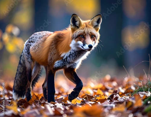 Fototapeta premium A vibrant red fox stands gracefully amidst a carpet of fallen autumn leaves...