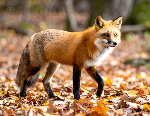 Fototapeta premium A vibrant red fox stands gracefully amidst a carpet of fallen autumn leaves...