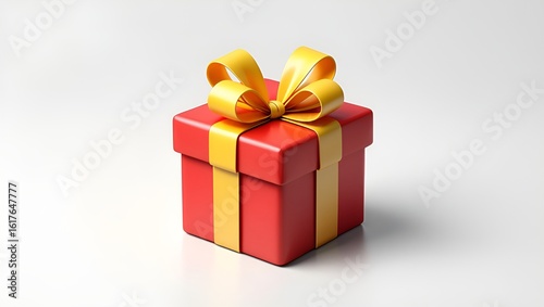Obraz premium A vibrant red gift box tied with a golden ribbon, casting a soft shadow on a clean white surface.
