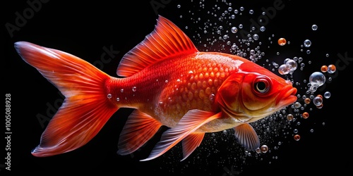 © Indigo Studio, Fototapeta premium A vibrant red goldfish swims through a cascade of iridescent bubbles against a stark black background.