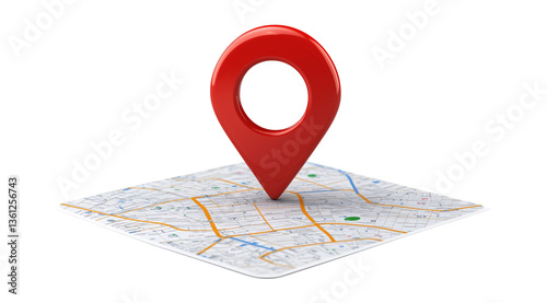 Fototapeta premium A vibrant red location pin marks a notable spot on a detailed urban map, indicating a precise location, isolated on white, PNG