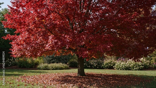 © The 2R Artificiality, Naklejka premium A vibrant red maple tree located in a public garden