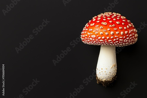 © padungsak, Obraz premium A vibrant red mushroom with white spots stands out against a black background, showcasing its unique and eye-catching features.