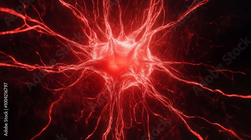 Obraz premium A vibrant red neuron with branching extensions, set against a dark...