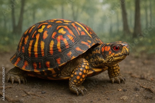 © Oleg, Obraz premium A vibrant red-orange turtle with intricate black patterns cautiously navigates a forest floor, its gaze fixed on the camera
