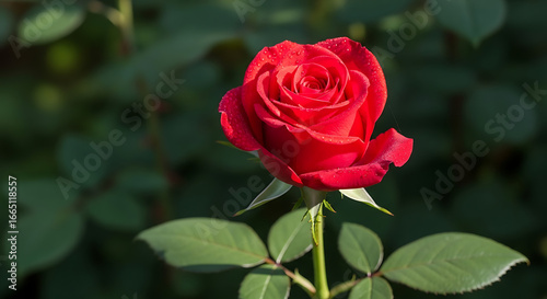 © Labib, Naklejka premium A vibrant red rose blooms in a lush green garden setting