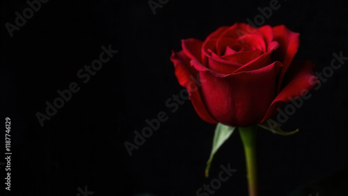 Fototapeta premium A vibrant red rose stands tall with intricate petals and green leaves, beautifully contrasted against a black background, highlighting its elegance and simplicity in a serene setting.