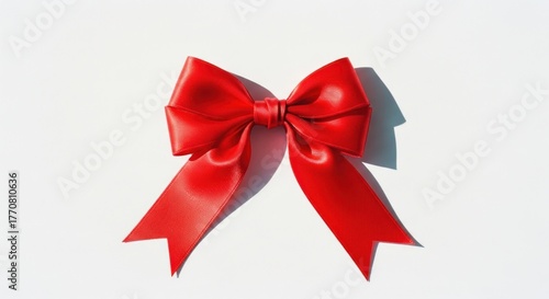 Fototapeta premium A vibrant red satin bow with elegant loops and tails rests on a clean white surface