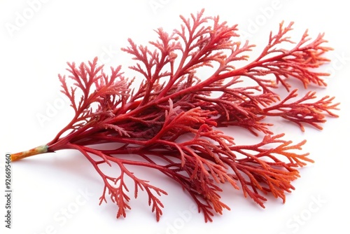 © Nima, Naklejka premium A vibrant red seaweed branch with delicate fronds, isolated on a pristine white background. It symbolizes nature's beauty, ocean life, and the intricate details of the underwater world.