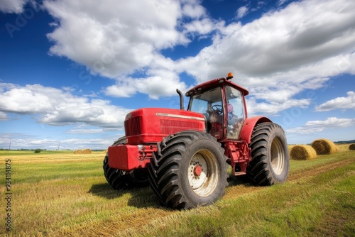 © KumCup, Obraz premium A vibrant red tractor on a harvested field under a blue sky with white clouds.