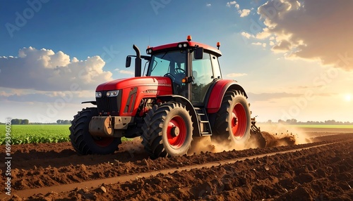 © Sevia, Fototapeta premium A vibrant red tractor plows a field of rich soil under a beautiful sunset sky.