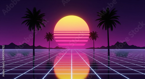 Naklejka premium A vibrant retro synthwave sunset with neon grid, palm trees, and mountains....