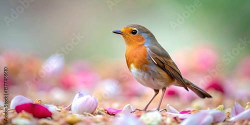 © Aumarin, Fototapeta premium A Vibrant Robin Perched Amidst a Carpet of Delicate Pink and White Petals, a Serene Springtime Scene