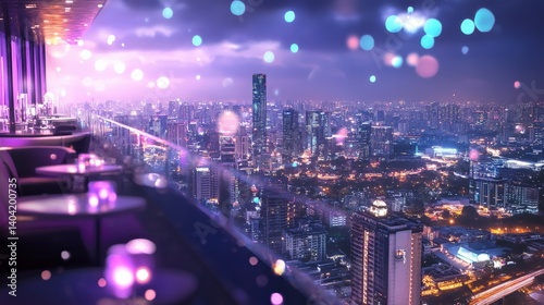Fototapeta premium A vibrant rooftop lounge overlooking a city skyline at dusk, with colorful bokeh lights