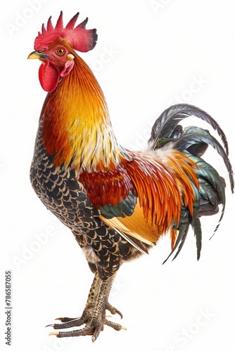 Fototapeta premium A vibrant rooster standing on a plain white background. Suitable for various...