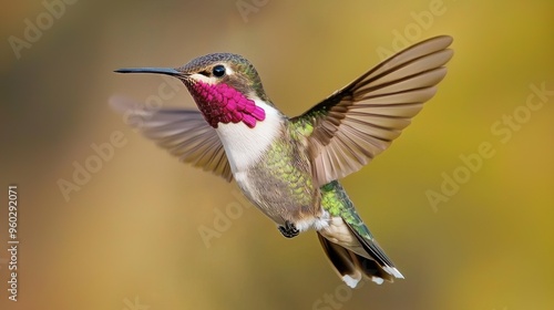 Fototapeta premium A vibrant ruby throated hummingbird captured in mid flight showcasing its...