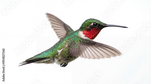 Obraz premium A vibrant ruby-throated hummingbird in flight displaying its iridescent green...
