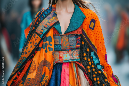 © Dzmitry, Obraz premium A vibrant runway showcase celebrating global textiles with intricate patterns and bold colors in an urban setting