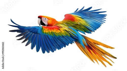 © Azat, Fototapeta premium A vibrant scarlet macaw with blue and green wings in mid-flight against a white background.