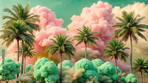 © PuriStudio, Fototapeta premium A vibrant scene featuring pink cotton candy clouds and lush green palm trees, creating dreamy and whimsical atmosphere. colors evoke sense of joy and tranquility