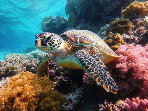 Naklejka premium A vibrant sea turtle swims gracefully through a coral reef, surrounded by...