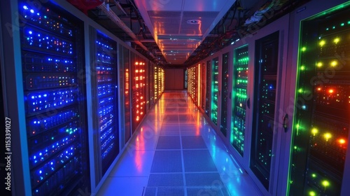 Fototapeta premium A vibrant server room filled with multi-colored neon lights reflecting off sleek data racks, creating a futuristic ambiance. This image conveys advanced technology and the dynamic nature of data