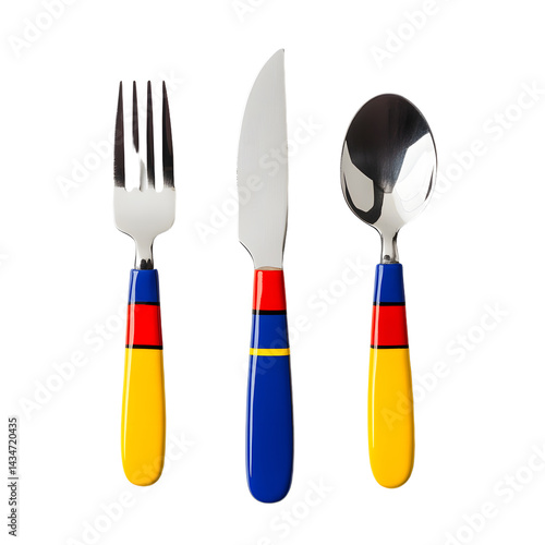 © cs, Fototapeta premium A vibrant set of cutlery featuring a fork, knife, and spoon with colorful handles, ideal for children's dining or festive meals