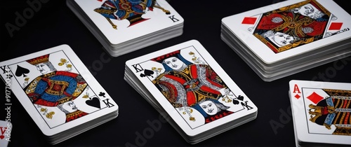 © Kumblack, Obraz premium A vibrant set of playing cards scattered on a black background, perfect for games